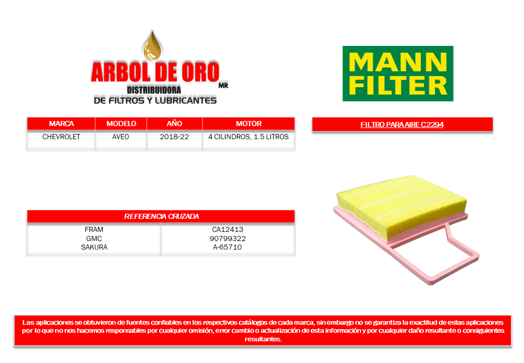 Filtro para aire de Chevrolet Aveo 4 cilindros, 1.5 litros 2018-22.