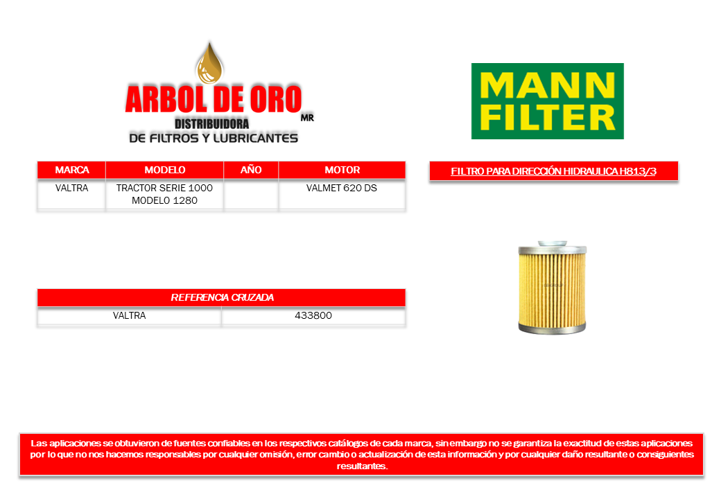Filtro para dirección hidraulica de tractor Valtra serie 1000 modelo 1280 con motor Valmet 620 DS.