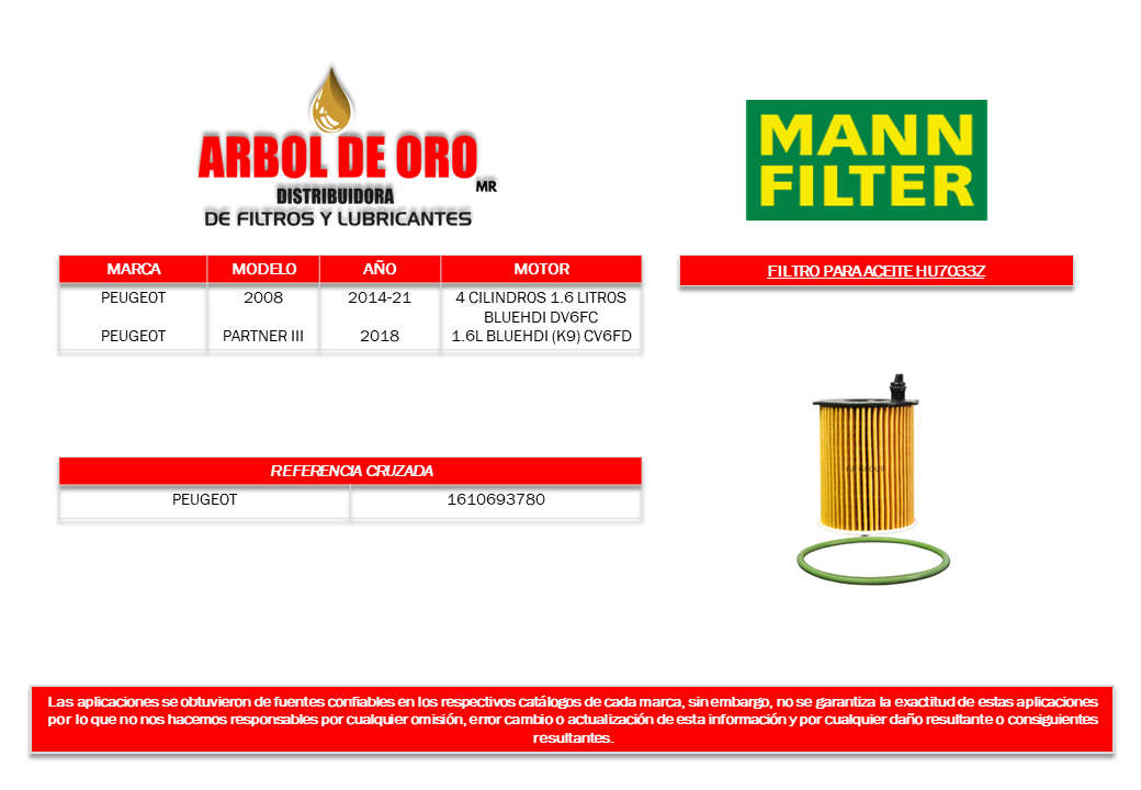 Filtro para aceite de Peugeot 2008 4 cilindros, 1.6 litros BLUEHDI DV6FC 2014-21, Peugeot Partner III 1.6 litros BLUEHDI (K9) CV6FD.