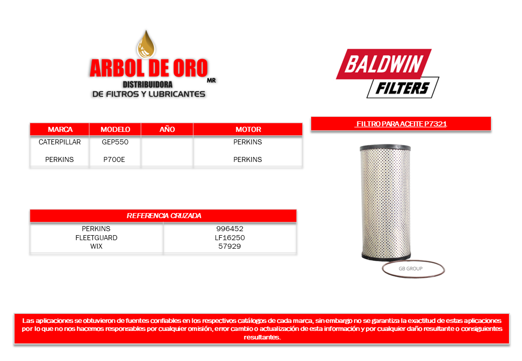 Filtro para aceite de Caterpillar GEP550 con motor Perkins, Perkins P700E con motor Perkins.