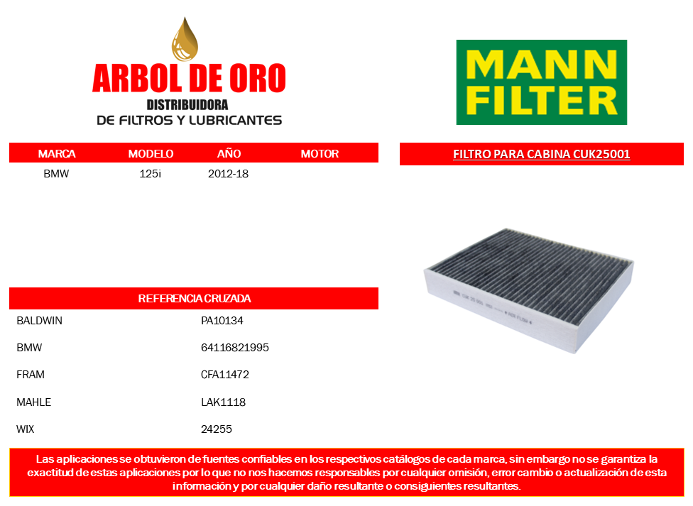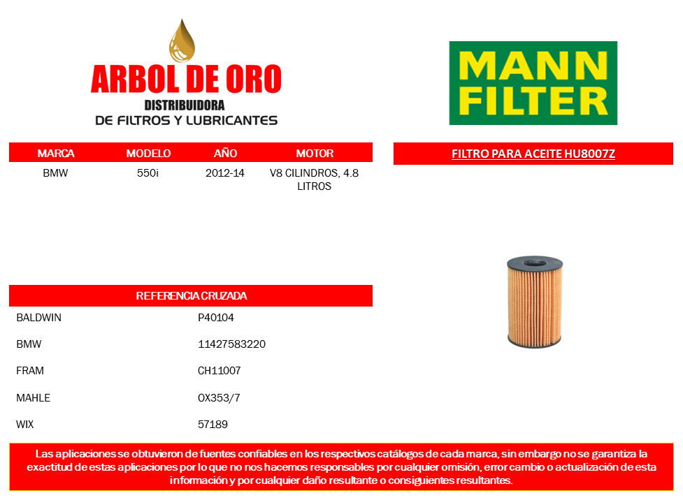 Filtro para aceite de BMW 550i V8 cilindros, 4.8 litros 2012-14.