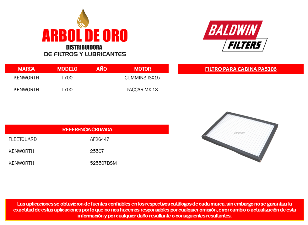 Filtro para cabina de Kenworth T700 con motor Cummins ISX15, Kenworth T700 con motor Paccar MX-13.