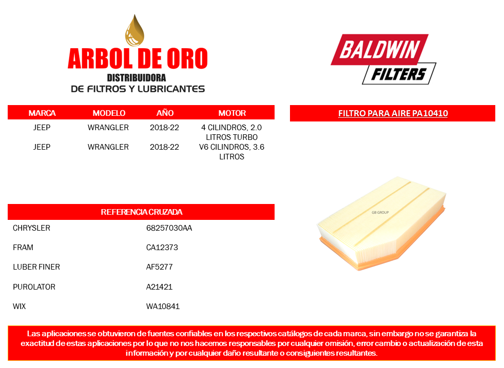 Filtro para aire de Jeep Wrangler 4 cilindros, 2.0 litros turbo 2018-22, Jeep Wrangler V6 cilindros, 3.6 litros turbo 2018-22.