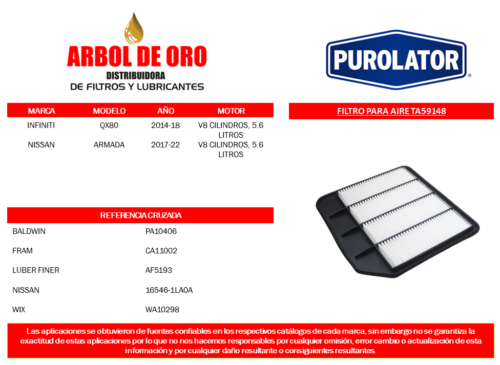 Filtro para aire de Infiniti QX80 V8 cilindros, 5.6 litros 2014-18, Nissan Armada V8 cilindros, 5.6 litros 2017-22.