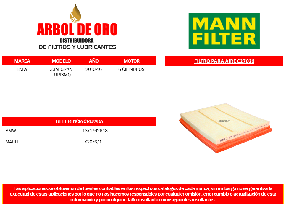 Filtro para aire de BMW 335i Gran Turismo 6 cilindros, 2010-16.