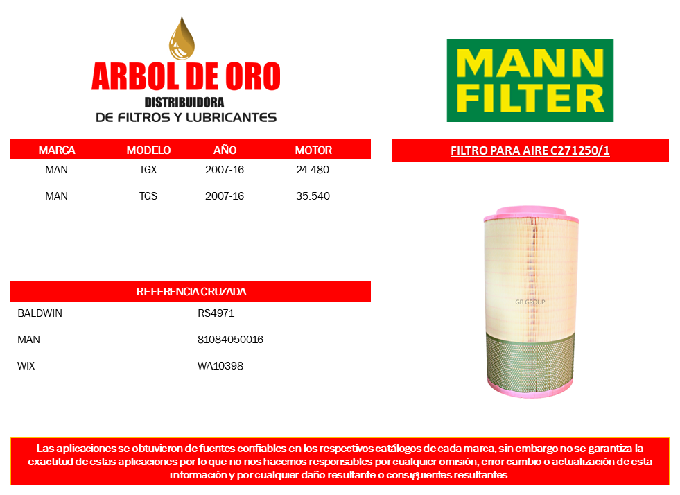 Filtro para aire de Man TGX motor 24.480 2007-16, Man TGS motor 35.540 2007-16.