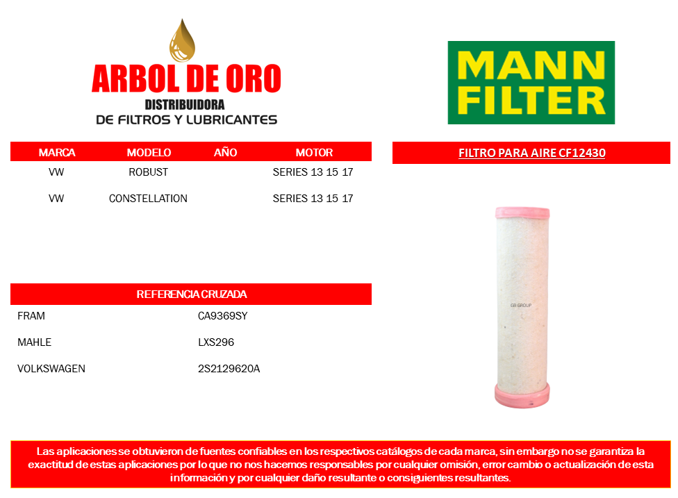 Filtro para aire de VW Robust motor Series 13 15 17, VW Constellation motor Series 13 15 17. Número de parte FRAM: CA9369SY