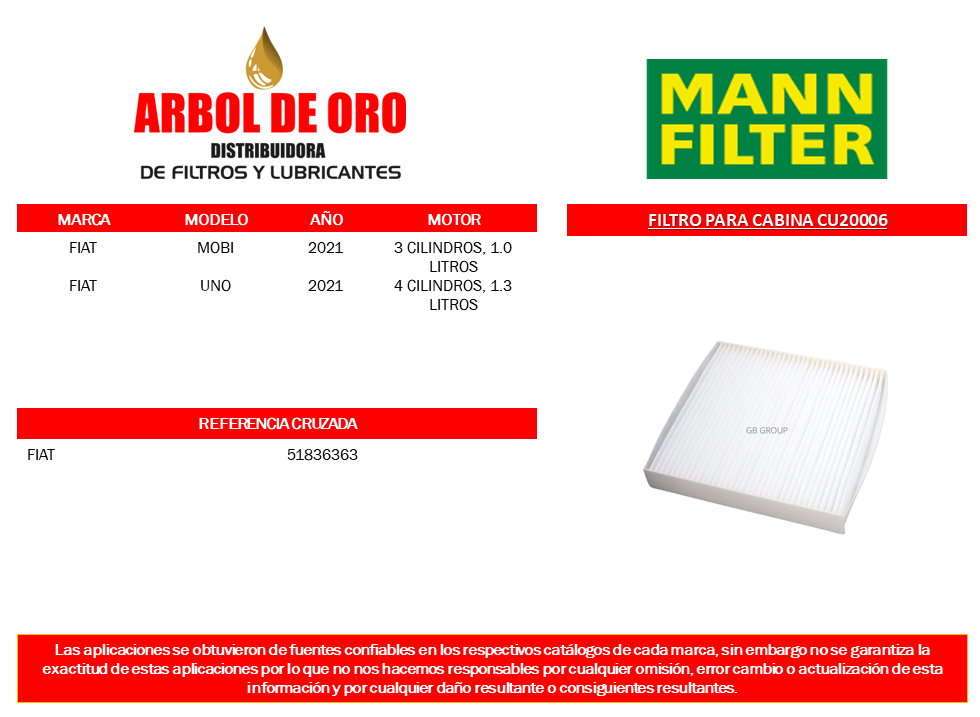 Filtro para cabina de Fiat Mobi 3 cilindros, 1.0 litros 2021, Fiat Uno 4 cilindros, 1.3 litros 2021.