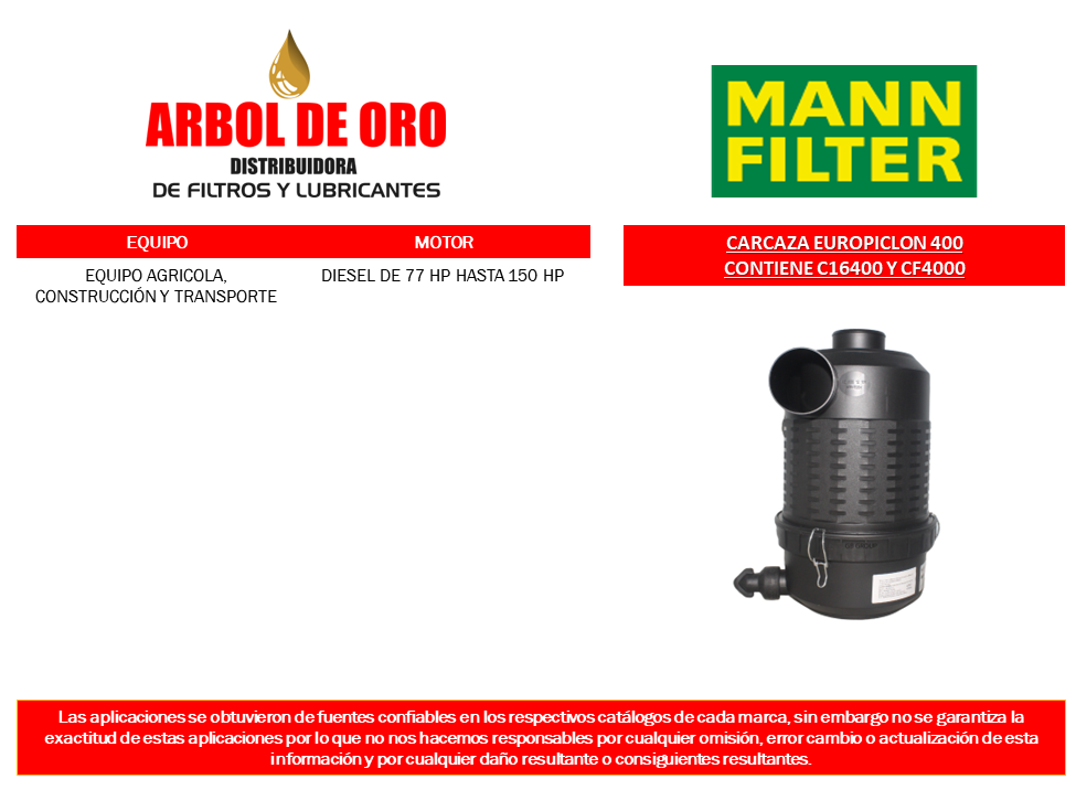 Carcaza europiclon, contiene C16400 y CF4000 de equipo agrícola, construcción y transporte con motor diesel de 77 HP hasta 150 HP.
